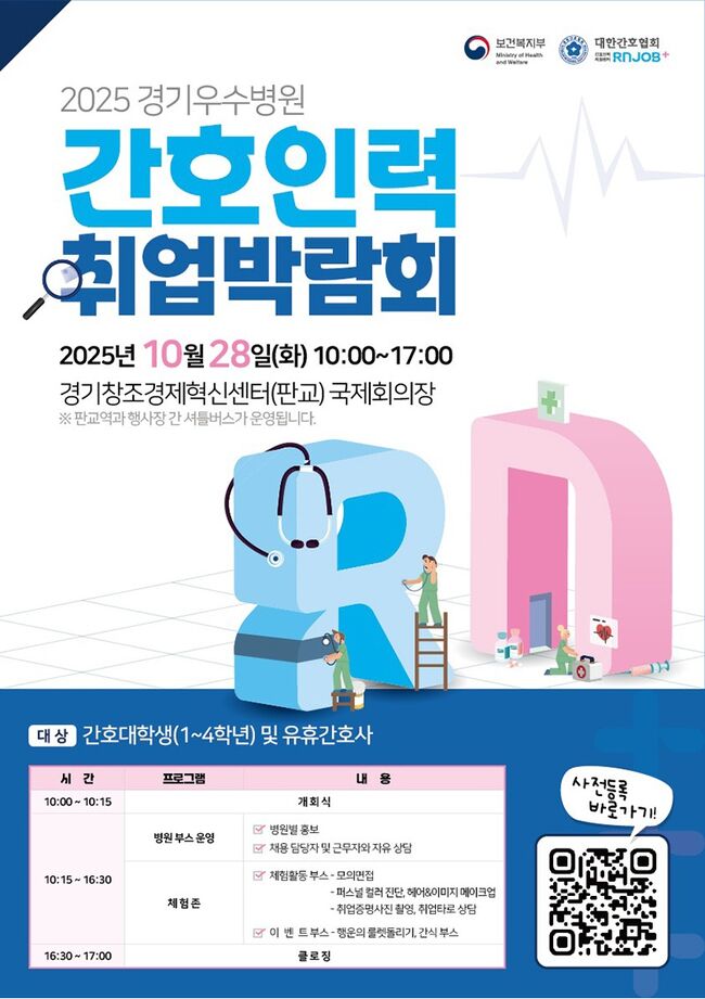 예비 간호사 및 유휴 간호사의 안정적인 취업과 경력 개발을 지원하기 위해 ‘2025 경기우수병원 간호인력 취업박람회’가 오는 10월 28일 오전 10시부터 오후 5시까지 경기창조경제혁신센터(판교) 국제회의장에서 열린다.