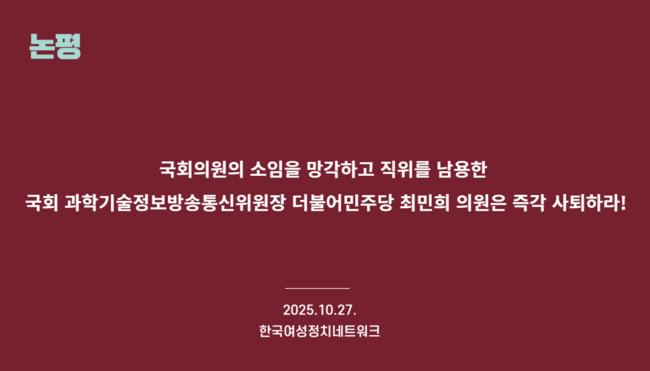 국회의원의 책무를 망각하고 권한을 사적으로 남용한 최 위원장의 행위에 대해 국민은 더 이상 신뢰를 보낼 수 없다. 한국여성정치네트워크는 이번 사안을 엄중히 규탄하며, 최민희 의원의 즉각적인 사퇴와 책임 있는 해명을 촉구한다. 아울러 국회 역시 이번 사안에 대한 철저한 진상조사와 재발 방지를 위한 제도적 장치 마련에 나설 것을 강력히 요구한다.