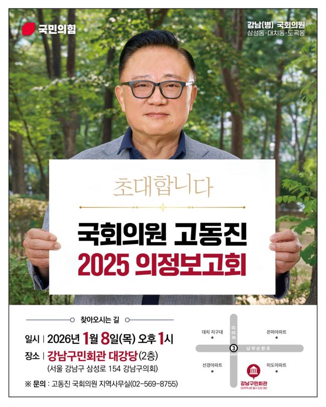 국회 행정안전위원회 소속 고동진 국회의원(국민의힘, 서울 강남구병)은 오는 8일(목) 오후 1시, 강남구민회관 2층 대강당에서 「2025 의정보고회」를 개최한다고 밝혔다.