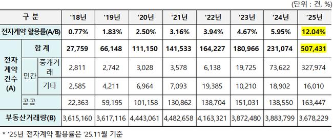 국토교통부에 따르면 집 매매와 전·월세 계약을 온라인으로 체결하는 부동산 전자계약이 빠르게 증가하고 있다. 2025년 한 해 전자계약 체결 건수는 50만7,431건으로, 전년 23만1,074건 대비 두 배를 넘어섰다. 전자계약 활용률 역시 12.04%를 기록해 처음으로 10%대를 돌파했다.